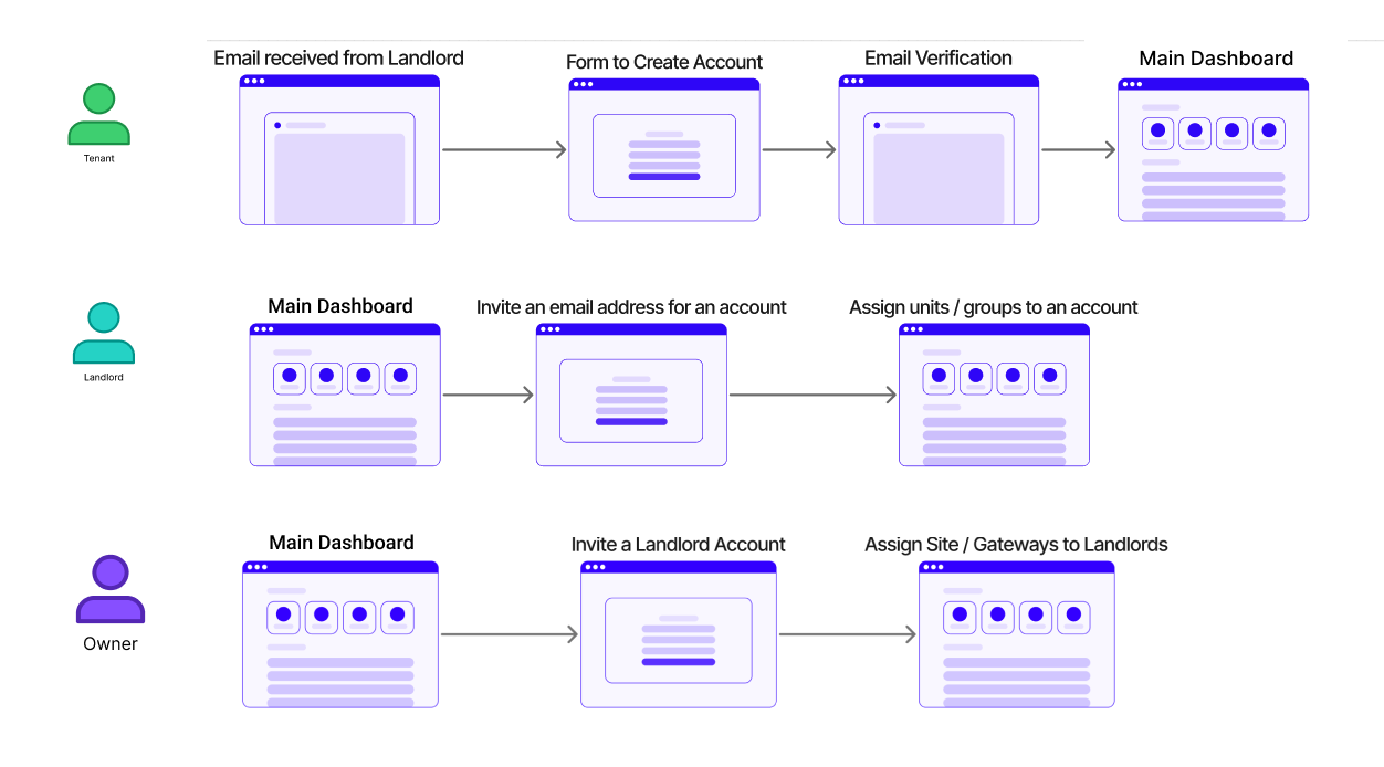 Owner initially adds managers and potentially tenants with each specific level of permissions and functionality in order to assign HVAC units.